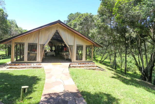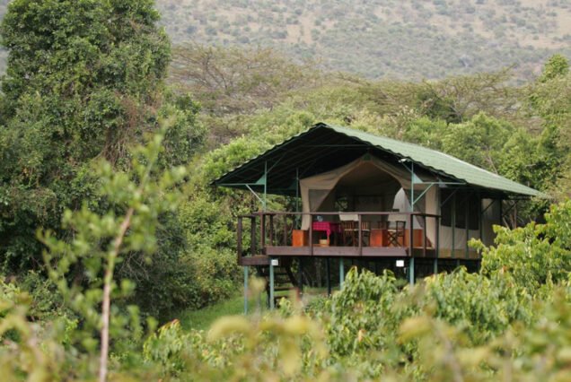 Sekenani Camp (website: sekenani-camp.com) is a charming, eco-friendly camp located just 6 km from the Sekenani Gate of the Maasai Mara. The camp features 15 raised tents spaced for privacy, each with a wooden floor and an en-suite bathroom including a full-length bathtub. The social areas — bar, dining, lounge — are linked by a suspension bridge over the river, creating a sense of adventure and connection with nature. Sekenani Camp is committed to sustainability: its power comes from a generator and renewable solar sources, and even the ice for the bar is solar-produced.